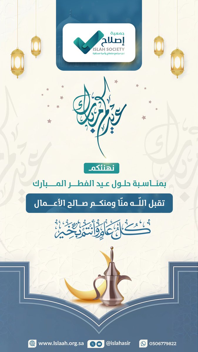 تتقدم جمعية إصلاح ذات البين بأسمى آيات التهاني والتبريكات بمناسبة عيد الفطر المبارك، سائلين الله أن يتقبل منا ومنكم صالح الأعمال، وأن يعيده علينا وعليكم بالخير واليمن والبركات.